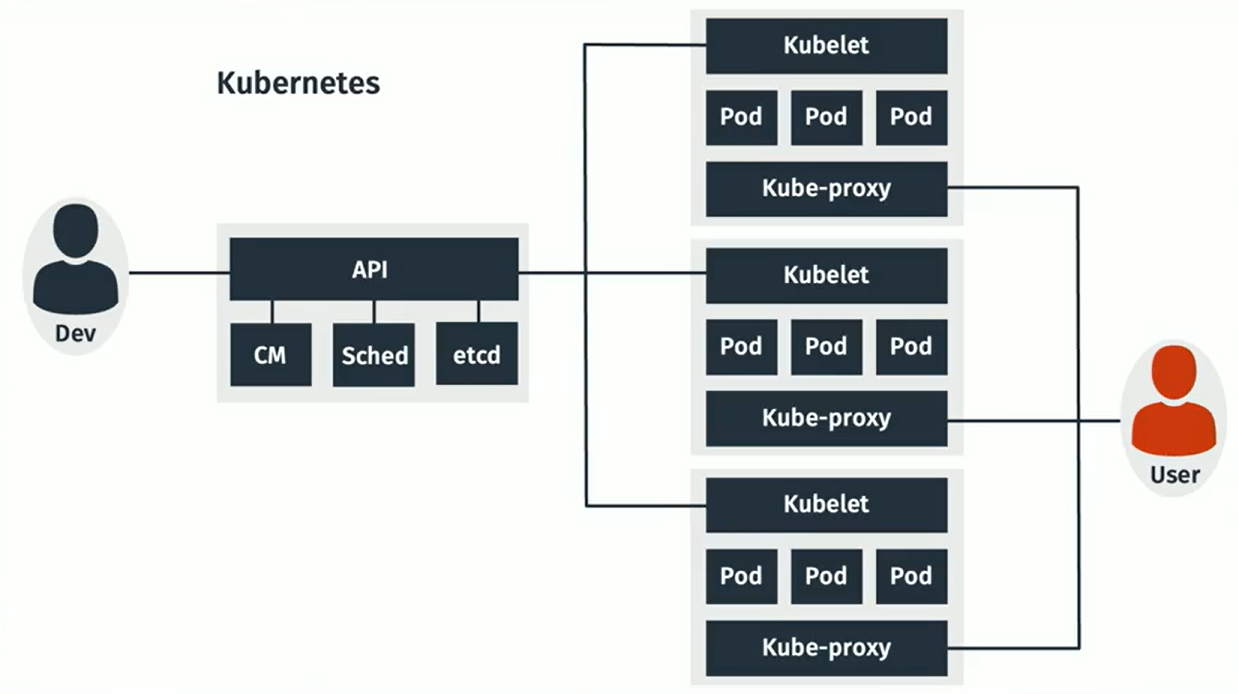 Developers use an API - made up of CM (Configuration Management database), sched (scheduler - scheduled deployment changes), and etcd (database used for managing configuration files across systems).